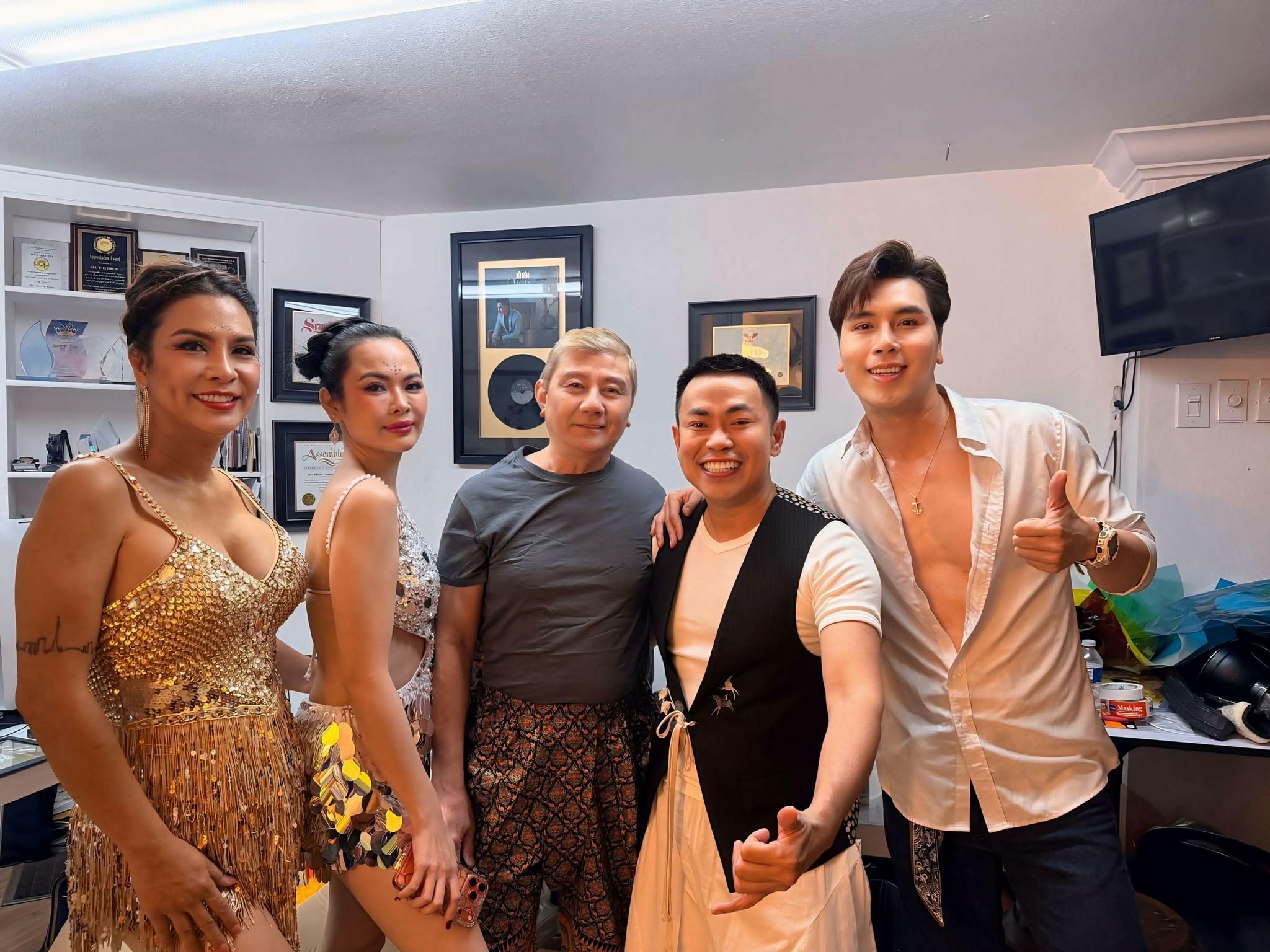 Hoàng Phi Kha chụp hình trong hậu trường cùng Hoài Tâm và các nghệ sĩ