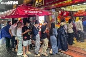 Bất chấp thời tiết Hà Nội mưa rào, dòng người vẫn đội mưa, xếp hàng...