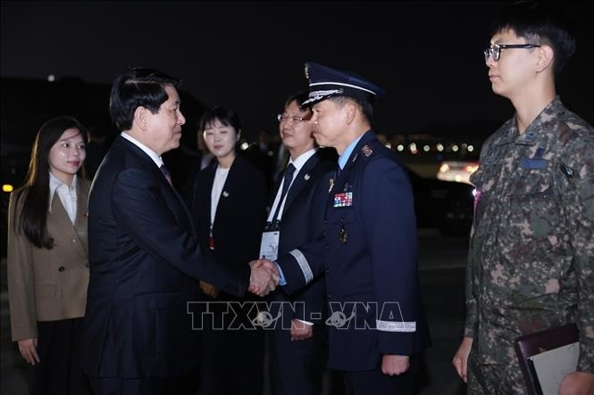 Chủ tịch nước Lương Cường rời sân bay Gimhae, kết thúc tốt đẹp chuyến tham dự Tuần lễ Cấp cao APEC lần thứ 32 và làm việc song phương tại Hàn Quốc. Ảnh: Lâm Khánh/TTXVN