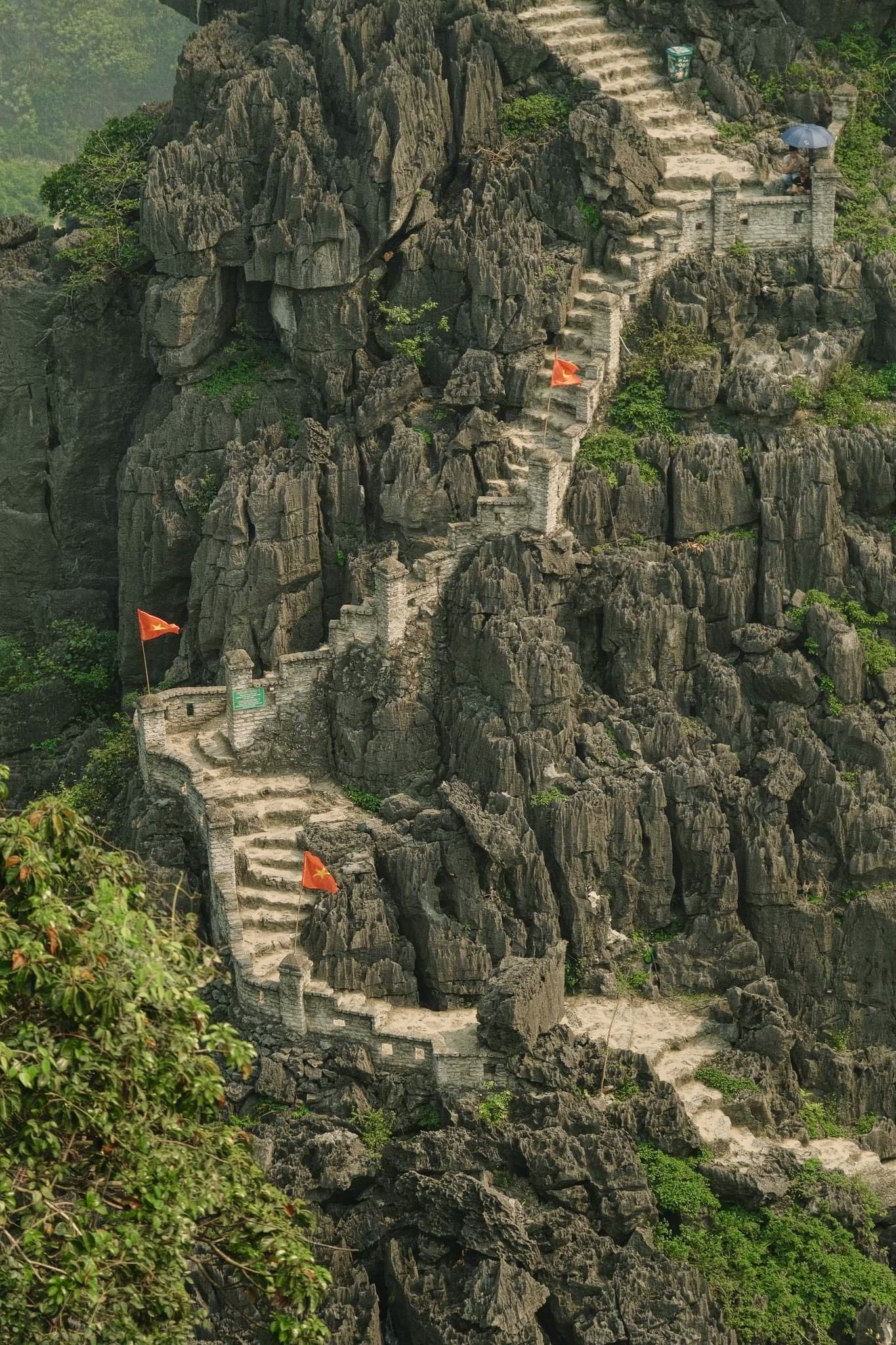 Để chinh phục đỉnh núi Múa, khách tham quan phải đi 486 bậc đá rêu phong, mô phỏng kiến trúc Vạn Lý Trường Thành. Đỉnh núi sẽ chia làm hai bên với tháp sống ảo và rồng chầu cùng tượng Phật bà Quan Âm.
