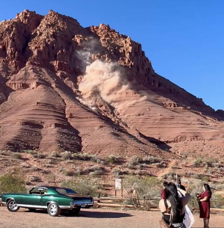 Sự việc xảy ra tại Ivins, bang Utah (Mỹ). Tại đám cưới, khi cô dâu chú rể vừa trao nhẫn, một tiếng nổ lớn vang lên từ phía sườn núi, kèm theo đó là đám bụi khổng lồ bốc cao, tạo nên khung cảnh vừa ngoạn mục vừa đáng sợ.