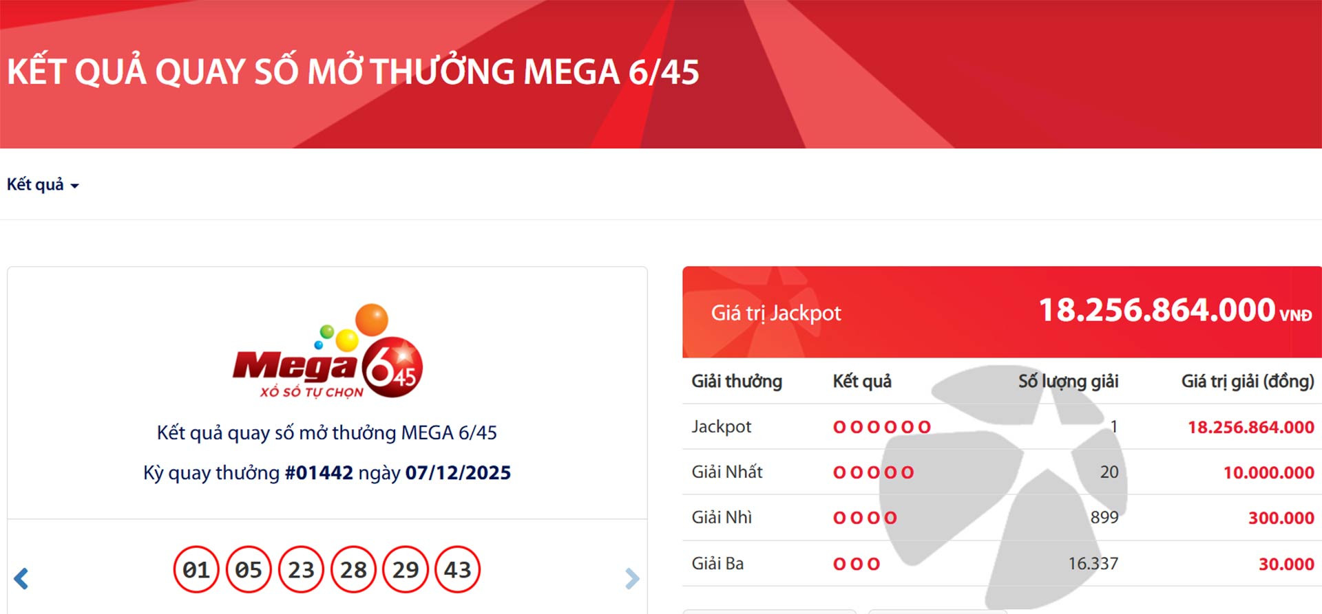 Công ty Xổ số Điện toán Việt Nam (Vietlott) thông tin, trong kỳ quay số mở thưởng lần thứ 1.442 của sản phẩm Mega 6/45 diễn ra tối nay (7/12), Hội đồng quay thưởng của Vietlott đã tìm ra 1 vé số trúng giải Jackpot với trị giá 18.256.864.000 đồng (hơn 18,2 tỷ đồng).