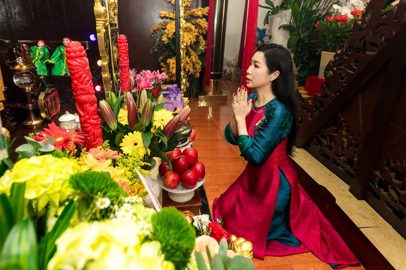 NSND Trịnh Kim Chi thành kính dâng hương lên bàn thờ Tổ. Á hậu Việt Nam 1994 nói bên cạnh việc tổ chức lễ cúng Tổ, những ngày này chị còn cùng nhiều đồng nghiệp chung tay gây quỹ, hướng về đồng bào miền Bắc gặp khó khăn do thiên tai, bão lũ. Bên cạnh vai trò nghệ sĩ, bà chủ một sân khấu kịch, Trịnh Kim Chi hiện giữ chức Phó chủ tịch Hội Sân khấu TP HCM.