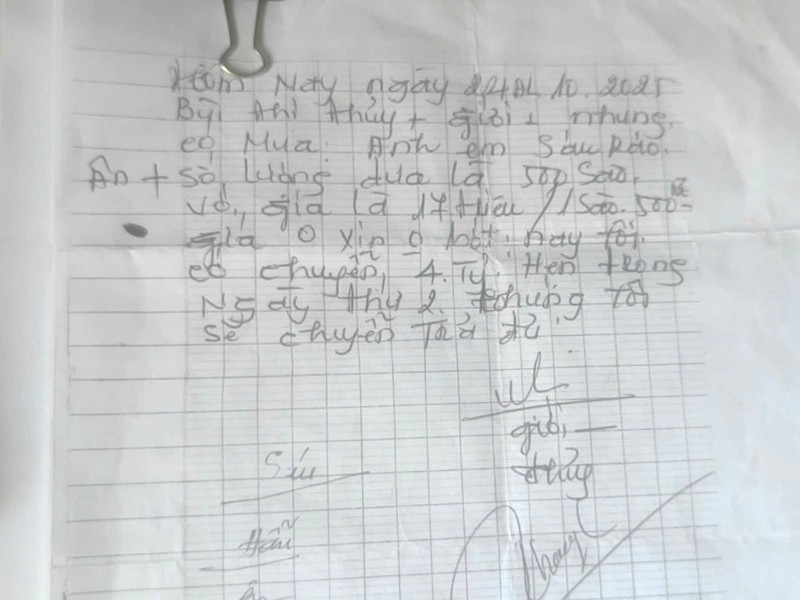 Giấy viết tay thỏa thuận mua bán giữa thương lái và người trồng dưa.